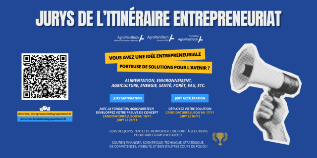 Vous avez une idée novatrice ou êtes porteurs d’un projet à impact dans les domaines du vivant et de l’environnement ? Candidatez à l’un des jurys de l’Itinéraire Entrepreneuriat et tentez de bénéficier d’un soutien financier, d’un accompagnement, de visibilité et bien plus encore ! Les jurys de l’Itinéraire Entrepreneuriat d’AgroParisTech s’adressent à tous les porteurs d’initiatives, qu’ils soient étudiants, diplômés, enseignants-chercheurs, personnels d’AgroParisTech ou incubés dans l’un des InnLabs d’AgroParisTech. Nous croyons fortement que l’innovation peut venir de partout et que chaque idée peut contribuer à faire une différence significative !