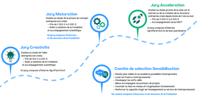 Dans le cadre de l’itinéraire Entrepreneuriat d’AgroParisTech, en partenariat avec AgroParisTech Innovation, elle offre un accompagnement 360° aux lauréats : financement, coaching de compétences, masterclass, visibilité et mise en réseau.